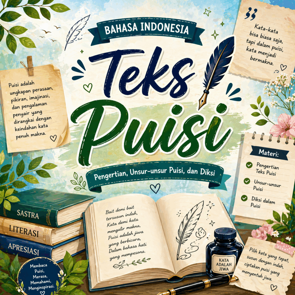 Pengertian Puisi Puisi adalah karya sastra yang mengungkapkan pikiran dan perasaan penyair dengan menggunakan bahasa yang padat, indah, bermakna kias, dan bersifat imajinatif. Dalam puisi, kata-kata dipilih secara khusus sehingga mampu menimbulkan imajinasi, emosi, dan makna yang mendalam bagi pembaca. Unsur-unsur dalam Puisi 1) Tema 2) Rasa: sikap penyair terhadap pokok permasalahan dalam puisi 3) […]