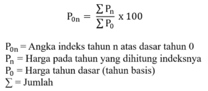 1. Agregatif tidak tertimbang. Perhitungan indeks harga agregatif tidak tertimbang mudah dan sederhana sebab hanya menjumlahkan harga rata-rata untuk tahun yang dihitung, lalu dibandingkan dengan jumlah harga pembanding (tahun dasar). Rumus menghitung indeks harga agregatif tidak tertimbang sebagai berikut: