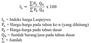 • Laspeyres. Metode Laspeyres merupakan perhitungan angka indeks tertimbang dengan faktor penimbang jumlah pada tahun dasar (Q0). Rumus metode Laspeyres: