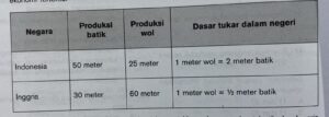 - Tabel berikut menggambarkan produk dua negara dengan pengulanan sumber daya ekonomi tertentu. Dalam perdagangan internasional Indonesia mengkhususkan membuat batik dan Inggris membuat wol. Hitunglah keuntungan pedagang Inggris dalam menjual 20 meter wol untuk mendapat batik setelah perdagangan internasional.